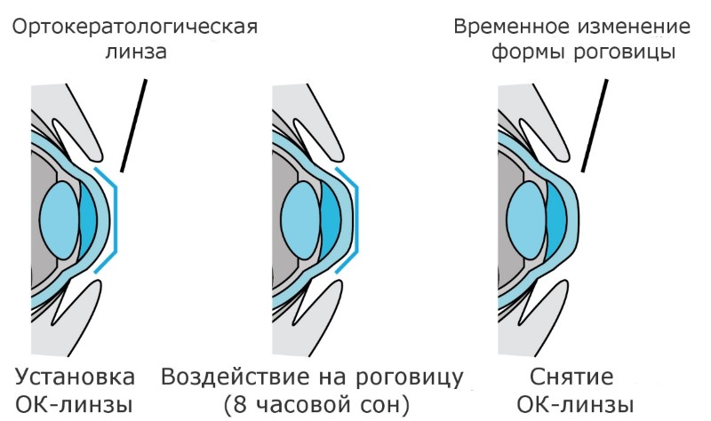 Пока вы спите, линзы воздействуют на эпителий (самый наружный слой роговицы). Форма роговицы изменяется ровно на столько, чтобы компенсировать вашу близорукость. Таким образом утром зрение улучшается. Эффект сохраняется в течение 24-48 часов и при постоянном использовании можно полностью отказаться от других методов коррекции.